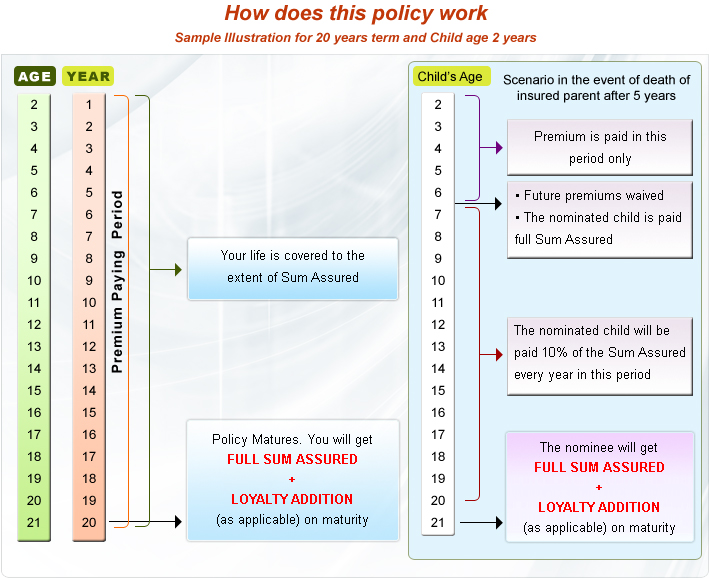 - At the end of policy term once again full sum assured is paid along with Loyalty addition
