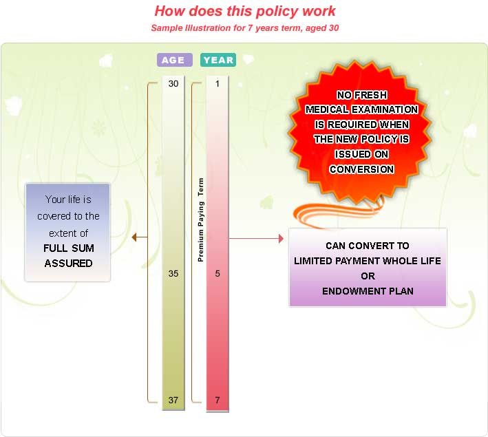 - Flexibility : Option to convert to an endowment or whole life plan, when funds are available