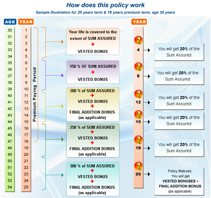 - The life cover starts with Sum Assured + Accrued Bonus. It grows by 50 % of Sum Assured every 5 years thereby providing greater protection with increasing responsibilities.