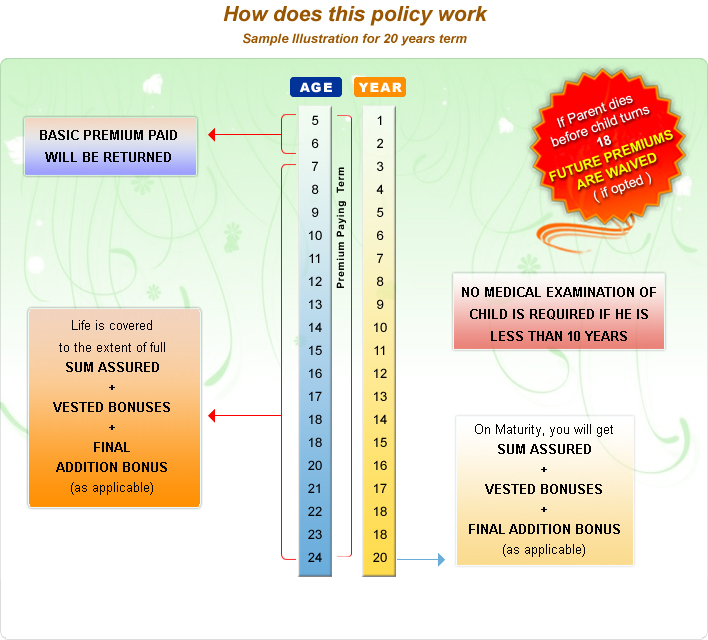 - Premium Waiver Benefit : All balance premiums waived if parent dies before the age of 18, if opted